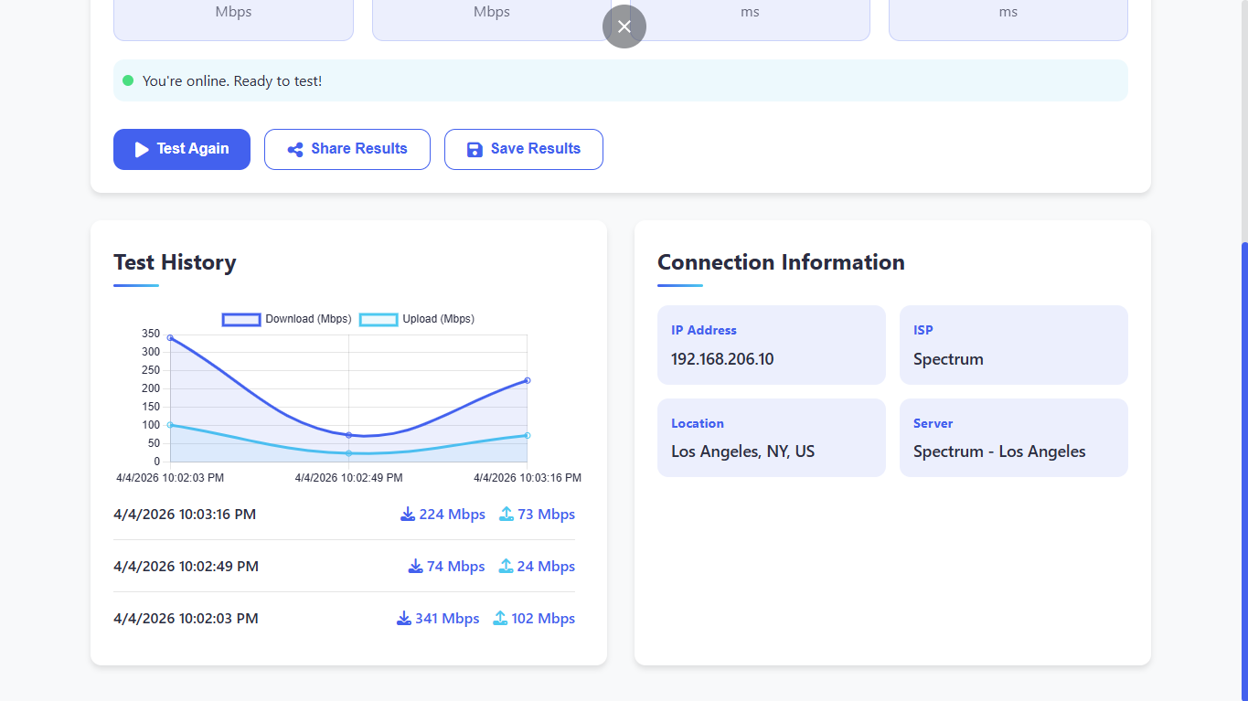A sleek and responsive Internet Speed Checker application built with vanilla HTML, CSS, and JavaScript. It provides real-time internet speed testing with a modern UI.